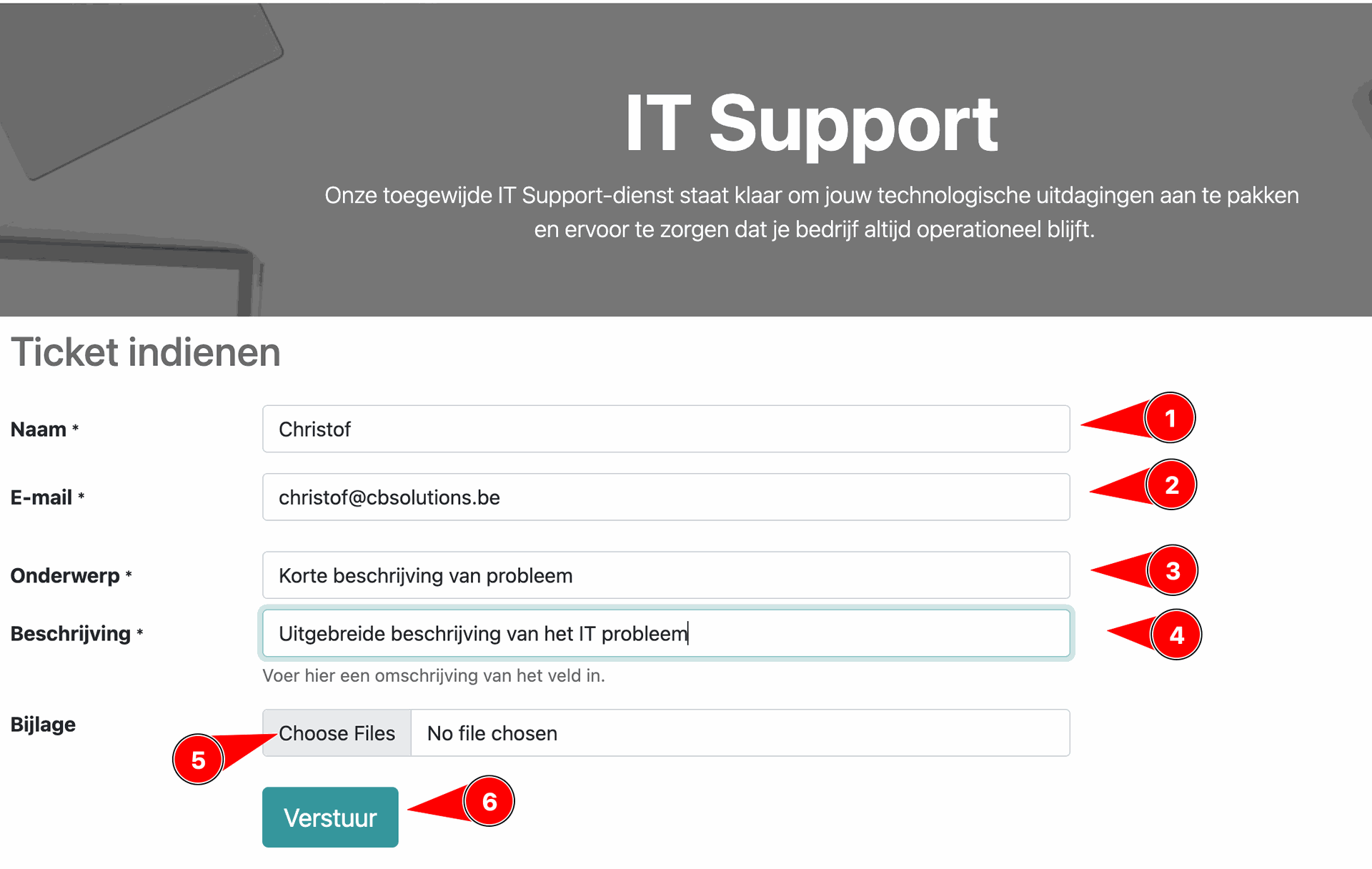 - beschrijving: uitgebreide beschrijving van je probleem en reeds uitgevoerde acties.